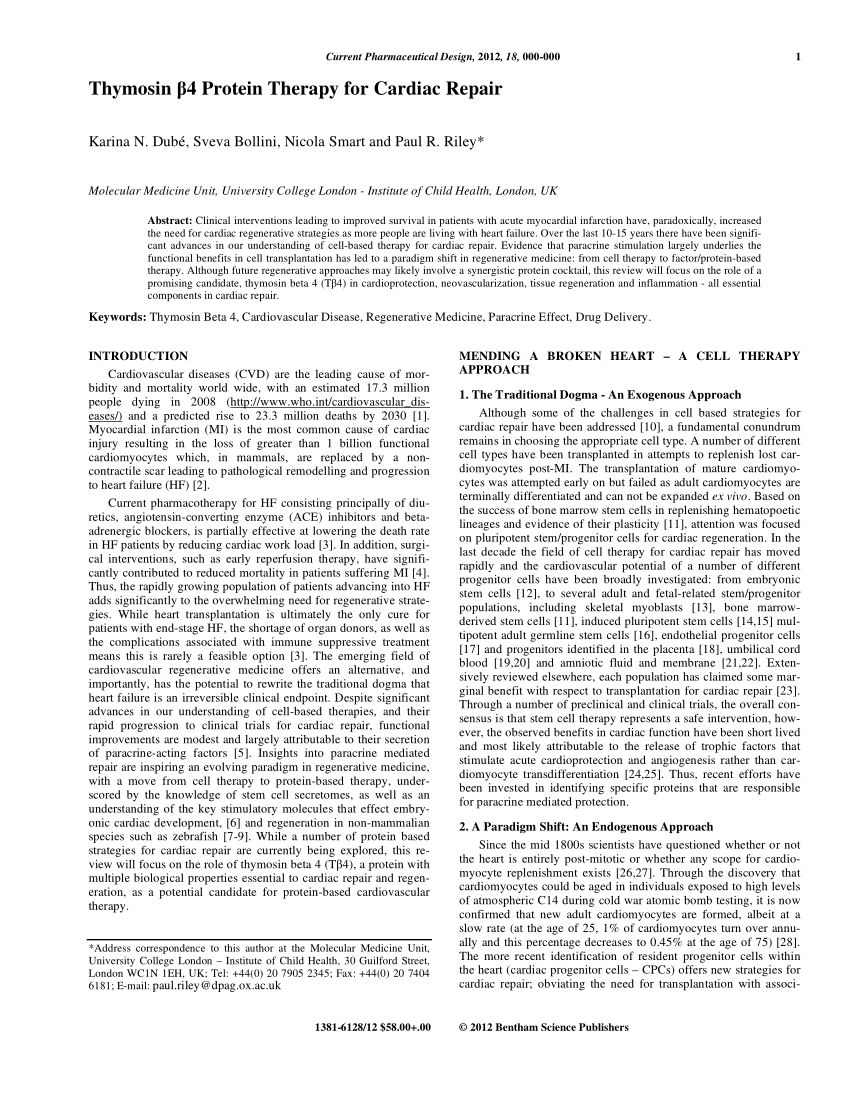 tβ4 reduces the infarct size and improves contractile performance in chronic myocardial ischemic injury through two phases: an acute phase that occurs immediately after injury, in which tβ4 preserves the ischemic myocardium via antiapoptotic or anti-inflammatory mechanisms, and a chronic phase, in which tβ4 activates the growth of vascular or …