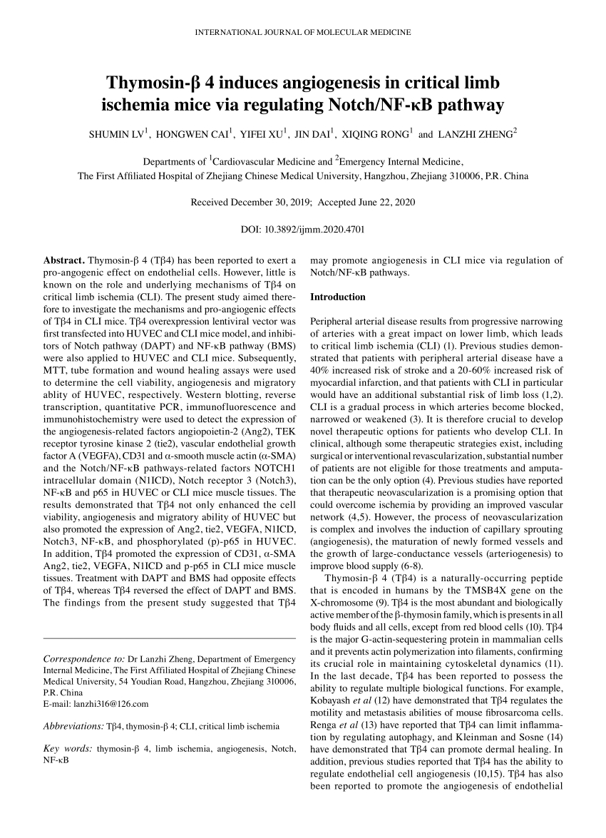 Thymosin beta-4 improves endothelial function and reparative potency of diabetic endothelial cells differentiated from patient induced pluripotent stem cells Authors Liping Su 1 , Xiaocen Kong 2 , Szejie Loo 1 , Yu Gao 3 , Bingli Liu 2 , Xiaofei Su 2 , Rinkoo Dalan 4 , Jianhua Ma 5 , Lei Ye 6 Affiliations